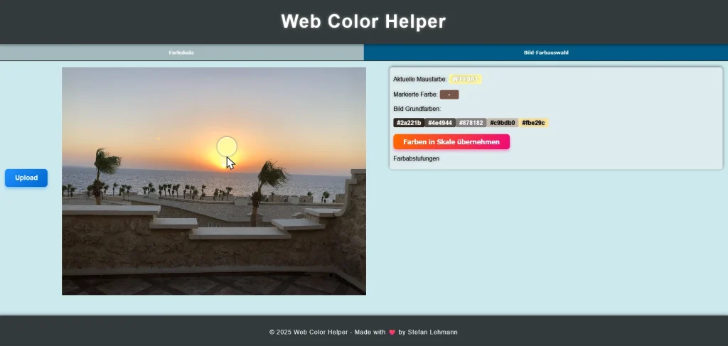 Das Tool analysiert im Hintergrund die Grundfarben und Durchschnittswerte des Bildes über die HTML5-Canvas-API.
